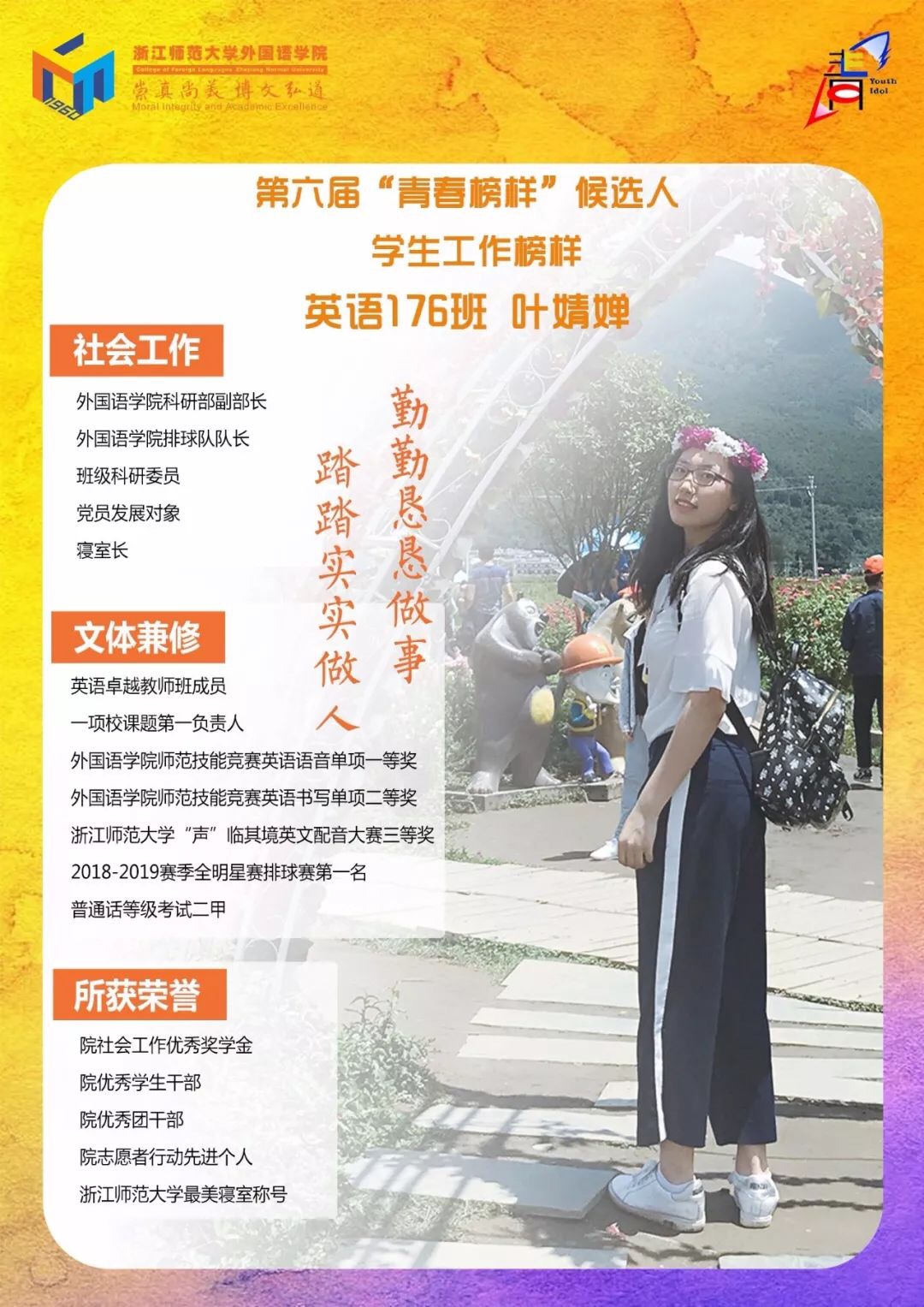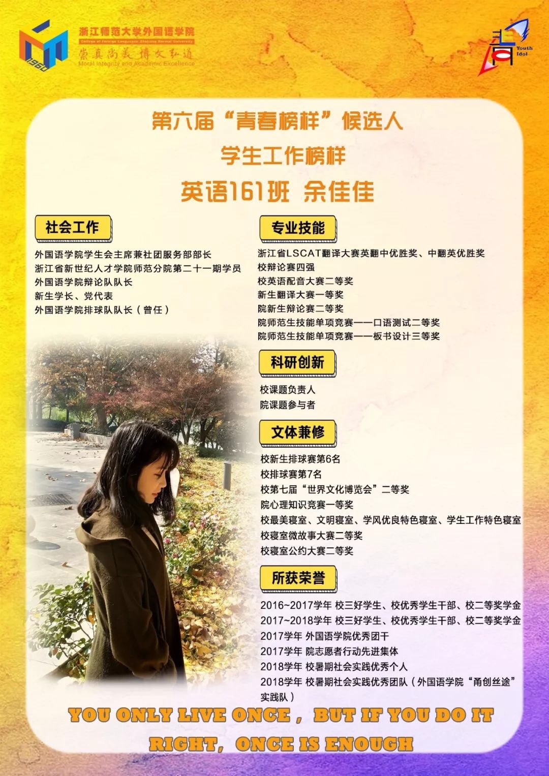 青春应该怎样度过? 是把从寝室到图书馆的路径走出自己的脚印? 是穿梭在忙碌的工作小组和教室之间? 亦或是遍地开花,打造多面的自我? 这条路上, 或有人相伴,或独自前行; 或欢喜,或愁苦。 但无论如何,青春都注定被铭记。 在浙师大外国语学院,就有这样一群人, 为着自己的理想,秉持自己的态度, 不言“困难”之字,不道“障碍”之语, 惟知跃进,惟知雄飞, 本其自由之精神,奇僻之思想,锐敏之直觉,活泼之生命, 书写自己的青春。 接下来,就让我们来一睹其人,看看他们是如何书写自己的青春的吧!