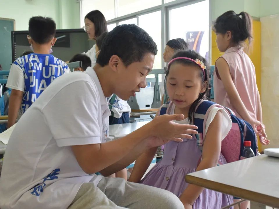 “小林老师来啦!”武义县青少年宫的小朋友们见到实践队授课组的队员兴奋不已。短短五天时间,随迁子女,也就是“小候鸟”们已不再怯生,与队员们在温暖有趣的课程中彼此陪伴,学习知识。经过前期与备课组一同对课程内容的细致打磨,实践队授课组的三位“小老师”为孩子们带来了“让武义红色故事走进课堂”系列课程,精选武义红色人物、历史、文化故事作为题材、素材、教材,将红色基因巧妙融入课堂文化教学,增强代入感和体验感。同时实践队队员还结合专业优势,开展红色英语启蒙教学活动,帮助“小候鸟”们更好地融入当地学习生活,以“善育”之心在他们心中播下红色的种子,让他们的七月有所沉淀、有所收获。在短短一周的授课时间里,“小老师们”曾为两个班级学生水平参差不齐而苦恼,或因嗓子干涩、腰酸背痛而疲惫,但是小朋友们纯真的笑脸、对知识渴望的眼神、一声声“老师好”和那临分别时挥舞的小手,又让一切变得值得。