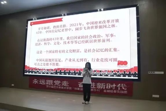 百年风华正青春 矢志建功新时代 浙师美院“印象田园·美丽乡村” 暑期社会实践队员 坚持知行合一 注重在实践中学真知 悟真谛 深入乡村调研发挥专业特色 用艺术赋能美丽乡村建设 用实际行动践行 “请党放心、强国有我”的青春誓言 为实现共同富裕 贡献青春力量