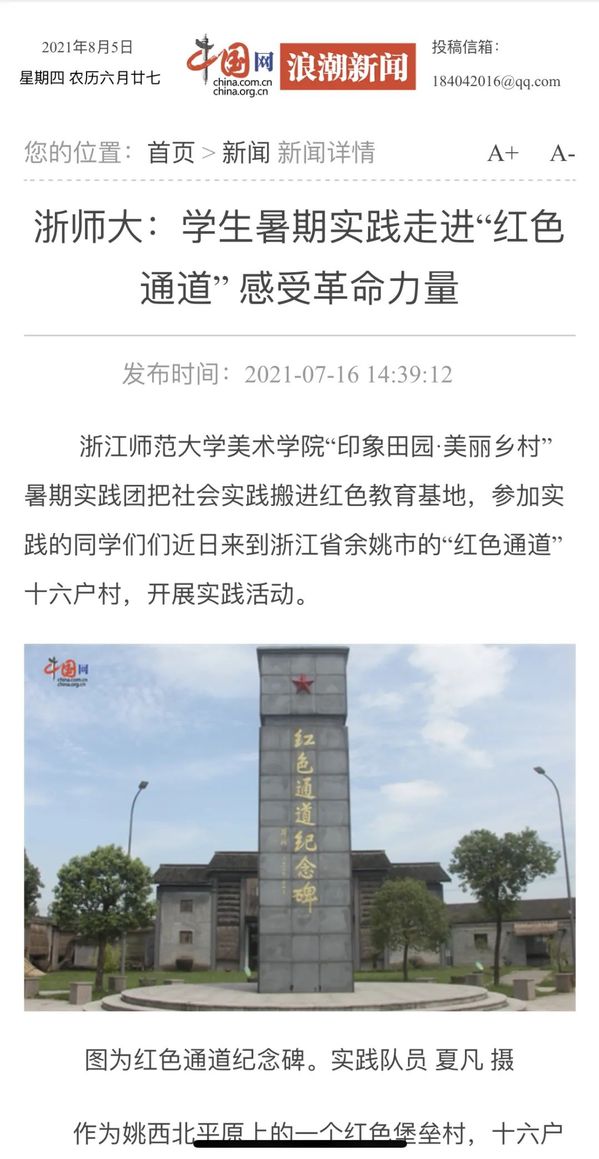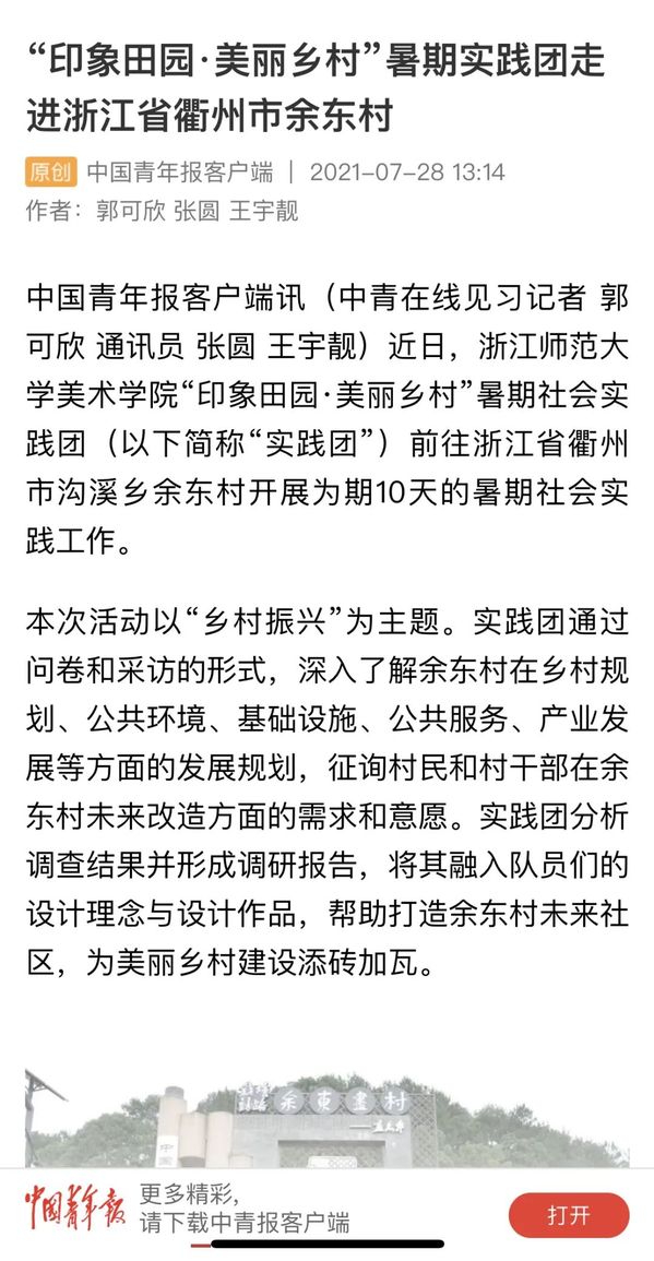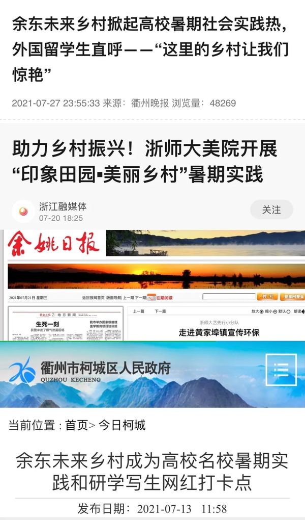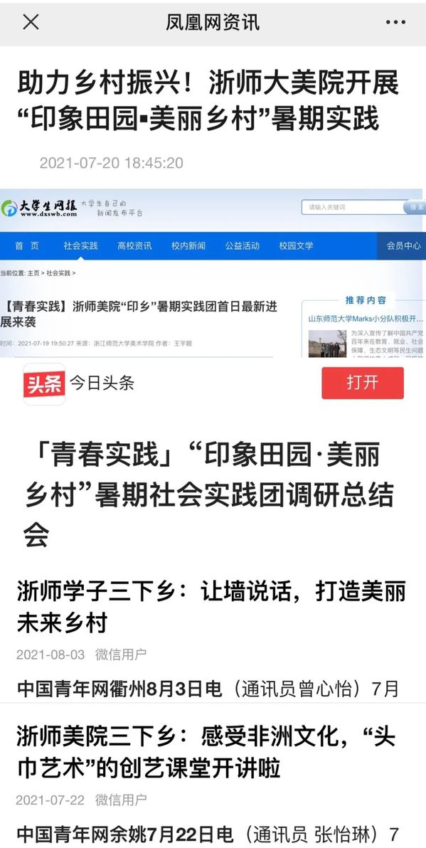 “印象田园•美丽乡村”暑期社会实践团开展的活动拥有广泛的社会影响力,不仅在浙师美院的官微发布多篇推送,还借助抖音、视频号等新兴媒体加大宣传力度,受到了中国青年报、中国网、浙江新闻、浙江融媒体、衢州及宁波当地媒体等多方关注,报道新闻多达五十余篇。队员们在社会实践中寻找初心,在传承红色基因中坚守初心,发挥专业特长助力美丽乡村建设,推动乡村振兴战略的实施,用青春奉献之歌献礼建党100周年。