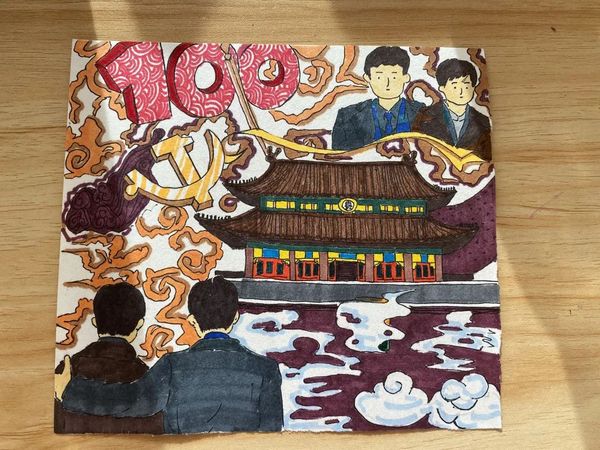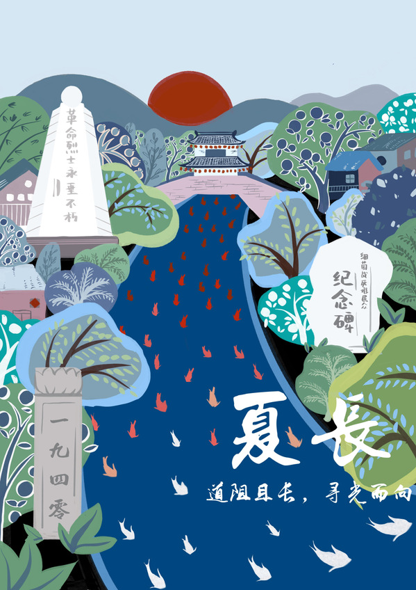 设计理念:作品结合余东村农民画与当地红色资源,体现出中国共产党获得胜利之前祖国经历的磨难,提醒人们时刻牢记历史,砥砺前行。