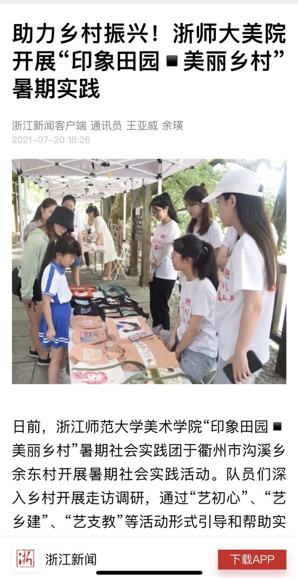 7月11日,浙江师范大学美术学院“印象田园·美丽乡村”暑期社会实践团分别奔赴衢州市沟溪乡余东画村和宁波余姚黄家埠镇开展暑期社会实践活动。活动围绕“艺初心”、“艺乡建”、“艺支教”、“艺先行”四块内容展开。 队员们深入乡村进行实地调研考察 充分了解地区特色和风土民情 开设各类公益课程 探求艺术带动乡村振兴发展新模式 开展党史学习 讲好党史故事 用实际行动绘制美丽乡村新画卷