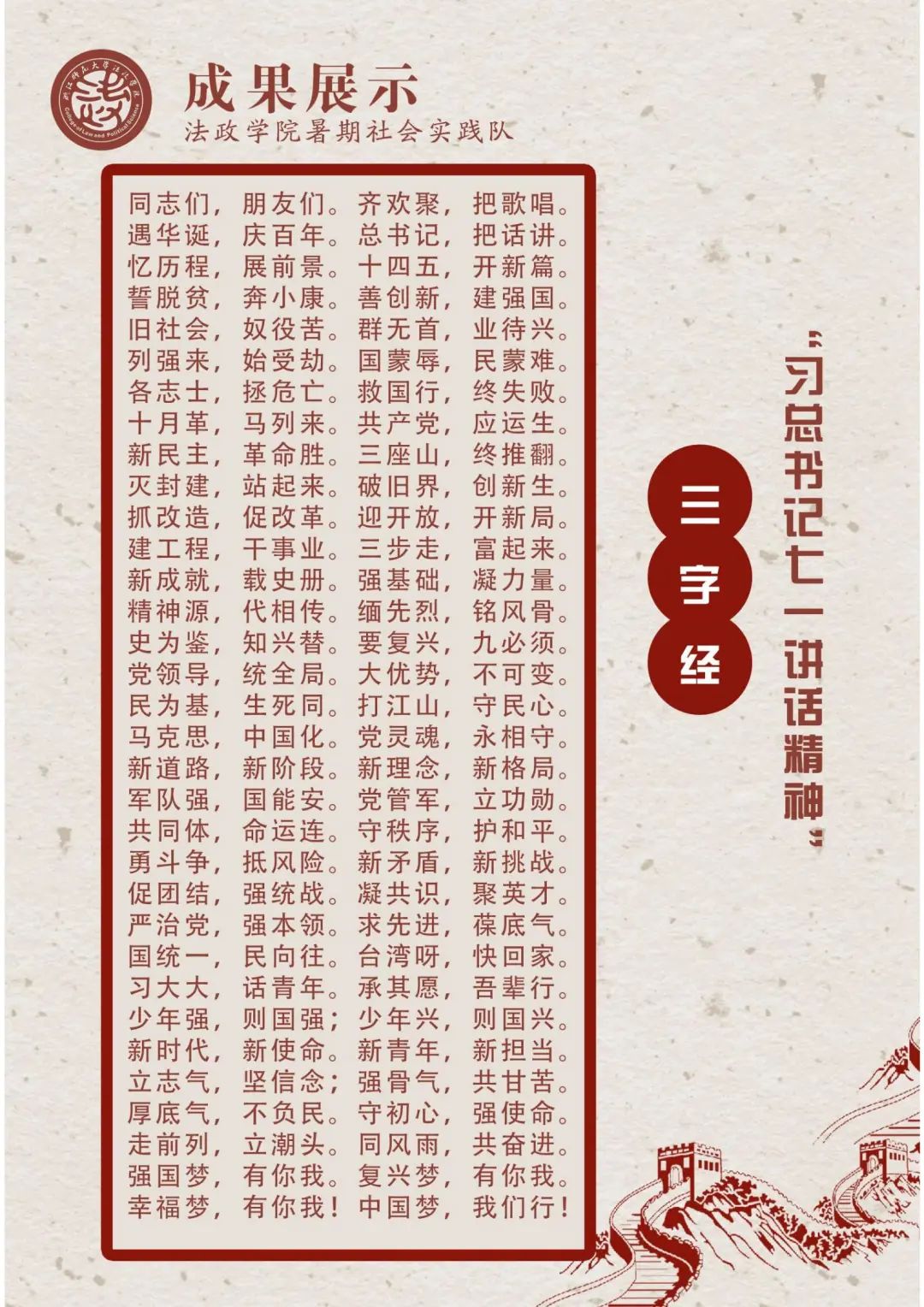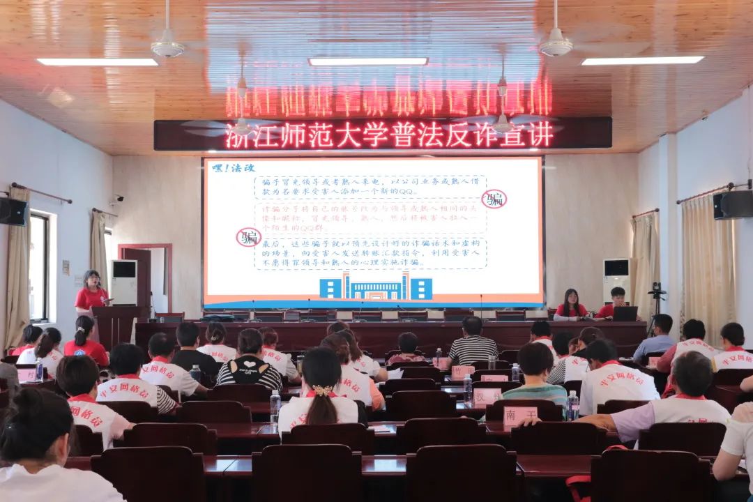 “炎炎日正午,灼灼火俱燃。”在这盛夏骄阳似火之时,为响应习近平总书记关于打击治理电信网络诈骗的重要指示精神,7月4日至7月19日,浙江师范大学法政学院暑期实践队以“百年流光中国梦,普法反诈青年行”为口号,忆一抹红色峥嵘,延一份精神长流,联合金华市婺城区公安局与反诈骗中心,立足法政特色,凝聚校地合力,增加普法深度,加大反诈力度,深入贯彻落实习总书记关于打击电信网络诈骗犯罪工作的重要指示精神,切实遏制电信网络诈骗的高发态势。 党史悠悠百年传,不负韶华担使命 襟怀千秋伟业,恰是百年风华,赓续百年骄傲。法政实践队全体队员不畏酷暑,在这个盛夏齐心携手,续写热爱,不负韶华,争做党史学习教育的先行者,努力学习和发扬党的伟大精神,为中国特色社会主义建设贡献出自己的力量,点亮星星之火。 “知所从来,方知所去”——党建微课堂我来讲 思忆百年党史,不忘精神谱系,共话青年使命。法政学院暑期实践队在这个建党百年的重要历史节点,以心中红星,献礼中华,利用学院公众号平台特别推出了建党百年特别专题微课堂。 少年的肩上不只清风朗月,更有家国担当。法政实践队队员拨开历史的画卷,以青春之名讲清澈挚爱,从建党的开天辟地到新中国成立的改天换地,再到改革开放的翻天覆地,最后到中国特色社会主义的惊天动地,实践队队员生动地讲述了中国共产党的光辉历程,而那段波澜壮阔的百年征程仿佛一幕幕地呈现在我们的眼前,浸湿了眼角,涤荡了灵魂,未来征途漫漫,百年初心坚如磐。 于无声处听惊雷,于峥嵘中悟精神。从革命时期的红船精神、井冈山精神、长征精神到建设时期的西迁精神、红旗渠精神、“两弹一星”精神,再到改革时期的抗洪精神、奥运精神、孔繁森精神,最后到新时代的探月精神、工匠精神、抗疫精神,法政实践队队员努力讲述并学习党历久弥新、克难而闪耀的精神谱系,涵养爱国之情,砥砺强国之志,努力挑起新时代建功立业的“后浪”之任。 “铭记历史,吾辈自强”——七七事变我牢记 史灯长明,手把红旗。七七事变的屈辱史犹在眼前,这是最好的教科书,也是最好的清醒剂。法政学院暑期实践队在七月七日这个特殊的日子里,不忘国耻,开展了“七七事变特别专题微团课”。追忆史册里那段腥风血雨的历史,先辈们虽遭受惨烈阻击却一往无前的冲锋姿态一幕幕放映在脑海里,这种深沉的爱国情怀我们自当时刻牢记,更应握紧时代的接力棒,不畏道阻且长,砥砺前行,为国争光。 “请党放心,强国有我”——时代强音我先行 时代殷殷嘱托,青年砥砺前行。此外,法政实践队成员深入学习了习总书记在庆祝中国共产党成立一百周年大会上重要讲话的精神,并以此为依据,充分利用《三字经》短小精悍且朗朗上口的特点,以及其在思想教育上对学生进行德育培养起着重要作用的功能,创作了党史学习教育特别版宣讲三字经,不仅为激励法政青年砥砺时代使命、不负韶华注入了“营养剂”,更是为实现中华民族的伟大复兴梦奏响了时代强音。 以法政之精神,绘反诈之星辰 百年流光中国梦,普法反诈青年行。法政实践队成员以青春之名担重任,以自身的汗水为证,激情踏上了社区普法反诈宣传的征程,亲身感悟法政精神里的“跋涉”,描绘全民反诈的闪耀星辰。 拉开序幕,请求出战 7月8日,浙江师范大学与婺城区打击治理电信网络新型违法犯罪工作联席会议办公室在人民广场举办了“心盟反诈宣讲团”启动仪式暨反诈纳凉晚会活动,实践队队员参与其中,表演了《反诈微课堂》《假霸总男友,真套路大师》《少年(反诈版)》等节目,引起了在场观众们热烈的反响,吸引了《浙江法制报》《金华日报》等各大新闻媒体的宣传报道。举办纳凉晚会,成立“心盟反诈宣讲团”,法政暑期实践队在各方的帮助下,创新了宣传方式,构建起宣传载体,为市民构筑了防范电信诈骗的一道防线,用喜闻乐见的方式传递反诈防骗的理念方法,为暑期反诈宣讲活动的推进开了一个好头。 制作反诈微课,依托网络宣传 七分粗心,不辨浊清;三分侥幸,误落陷阱。要知道,时代在进步,骗子的诈骗手段也在不断进步,预防诈骗的难度更是不断加大。实践队员利用学院公众号和抖音等平台,以反诈微课堂的形式,积极向大家宣传了十大常见诈骗类型,提醒广大市民朋友“诈”弹危险,请勿接近,很好地帮助人民群众在线上高效地学习相关反诈知识,从而做到在线下避免落入骗子设计好的圈套。 深入社区宣讲,守护财产安全 盛夏滚烫,藏满了人间理想。炎炎夏日,实践队员乘着灼灼朝日之辉,觅得斑驳树影,一路欢声笑语,向着金华婺城的各个社区进发。从展示精心制作的十大诈骗类型展板到站上主讲台灵动地讲解反诈知识,再到组织观看反诈小视频和举办法治游园会,实践队员与群众热情互动,通俗易懂地揭露了诈骗分子的常用伎俩和手段,得到了在场群众的热烈欢迎。宣讲结束后,实践队员随即发放反诈小测试问卷,让在场群众及时巩固所学,并邀请在场群众积极参加“百人签名”活动,以期全民协力反诈骗,携手共进把财护。 习近平总书记强调,反诈工作要“坚持以人民为中心,全面落实打防管控措施,坚决遏制电信网络诈骗犯罪多发高发态势”。在中国共产党成立100周年之际,法政学子争做笃志青年,启航反诈之路,多举措推进“全民反诈”普及活动,与时