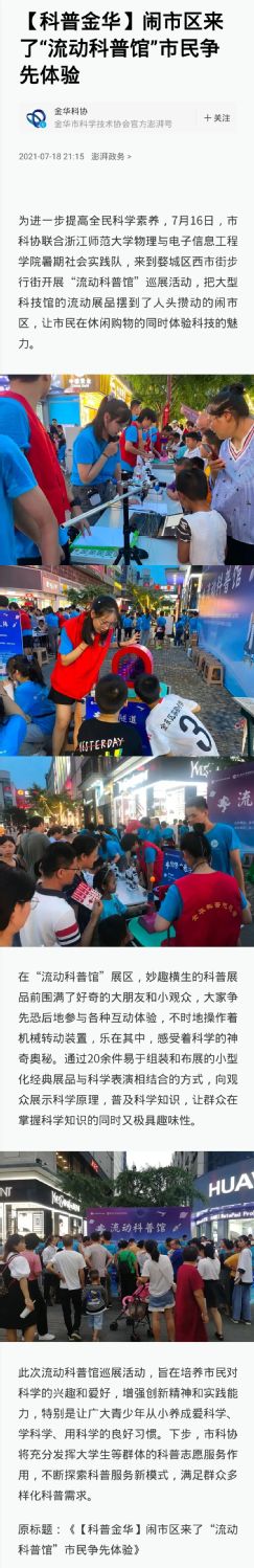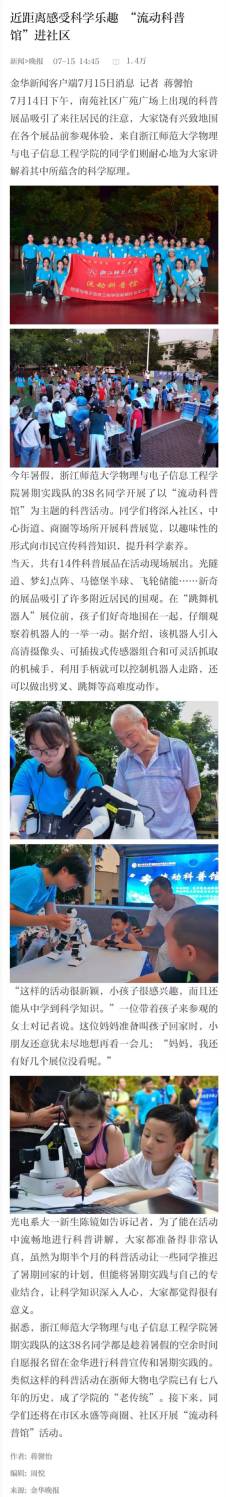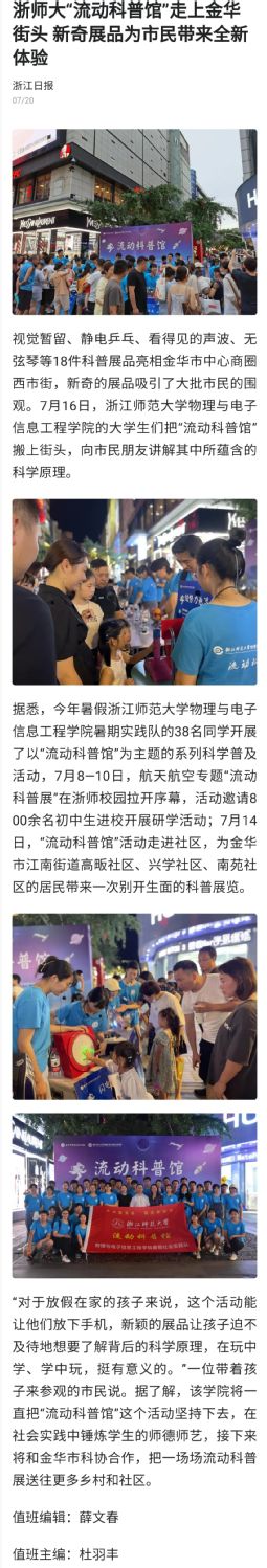 7月3日至7月17日,浙江师范大学物理与电子信息工程学院开展了以“流动科普馆”为主题的暑期实践活动。38名实践队成员通力合作、齐心协力,在浙师校园、江南社区和金华中心商圈利用现代科技和实物教具让市民朋友们近距离感知科学魅力。
